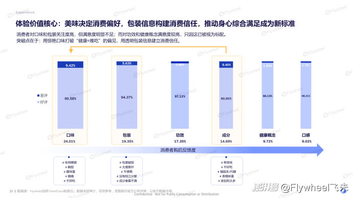 到了最后的Experience产品体验环节,消费者的实际感受直接决定了复购意愿与潜在客户的转化可能。而从数据来看,消费者对产品口味和包装设计的关注度最高,但满意度明显不足。与之相对,功效和健康概念的好评率较高,但关注度相对较低,这表明良好的功效已成为产品的基础要求,而非差异化优势。