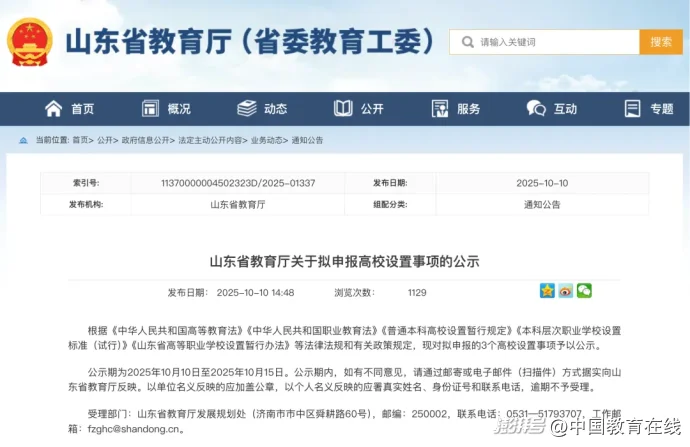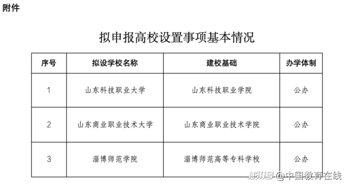 10月10日,山东省教育厅发布《关于拟申报高校设置事项的公示》。公示内容显示: