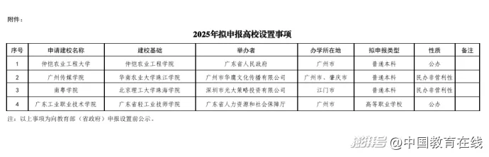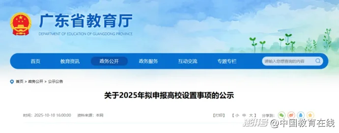 10月10日,广东省教育厅发布关于2025年拟申报高校设置事项的公示。