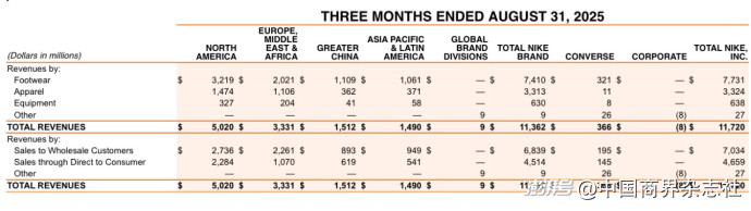耐克2026财年第一季度各地区营收数据。(图片截自耐克财报)