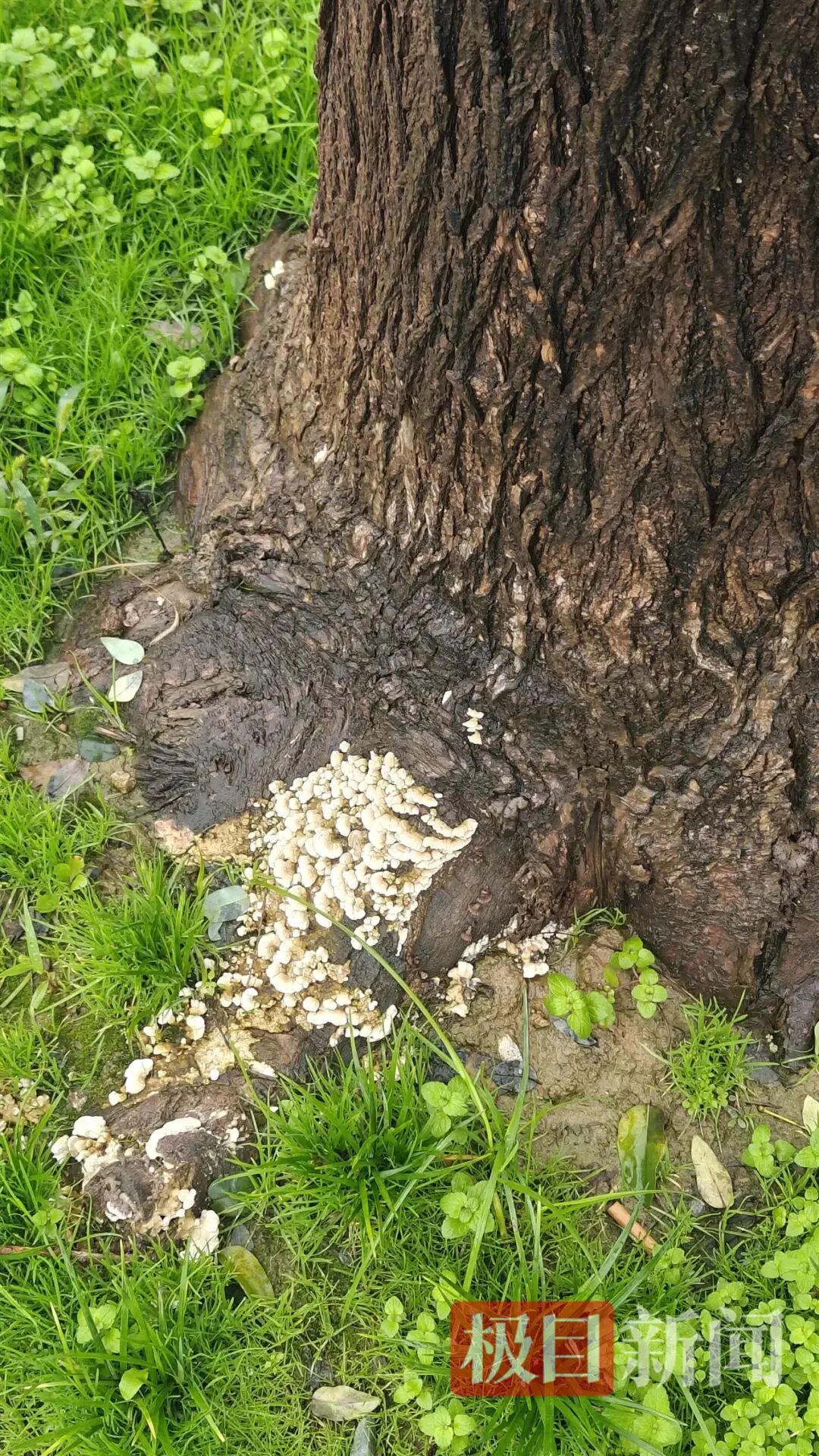12日下午,记者在街头发现,路边的大树几乎每隔几步都能看到长满蘑菇,部分树干还长出了木耳等菌类生物。
