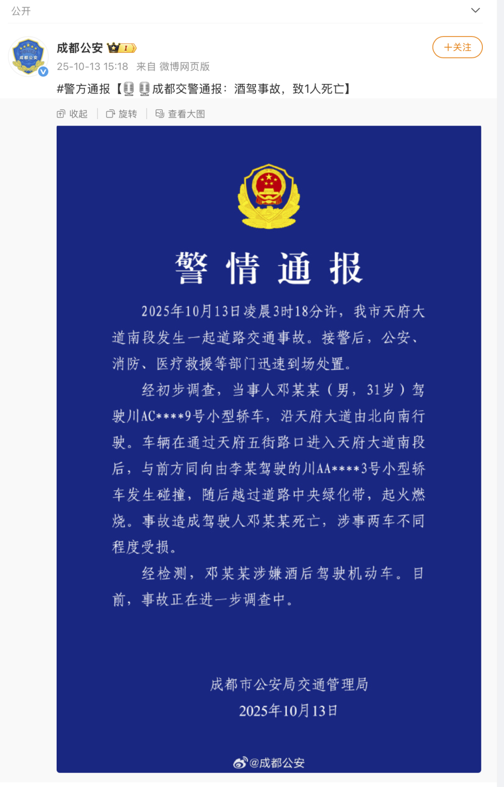10月13日,微博账号“成都公安”以《成都交警通报:酒驾事故,致1人死亡》为题,发布警情通报称:2025年10月13日凌晨3时18分许,我市天府大道南段发生一起道路交通事故。接警后,公安、消防、医疗救援等部门迅速到场处置。