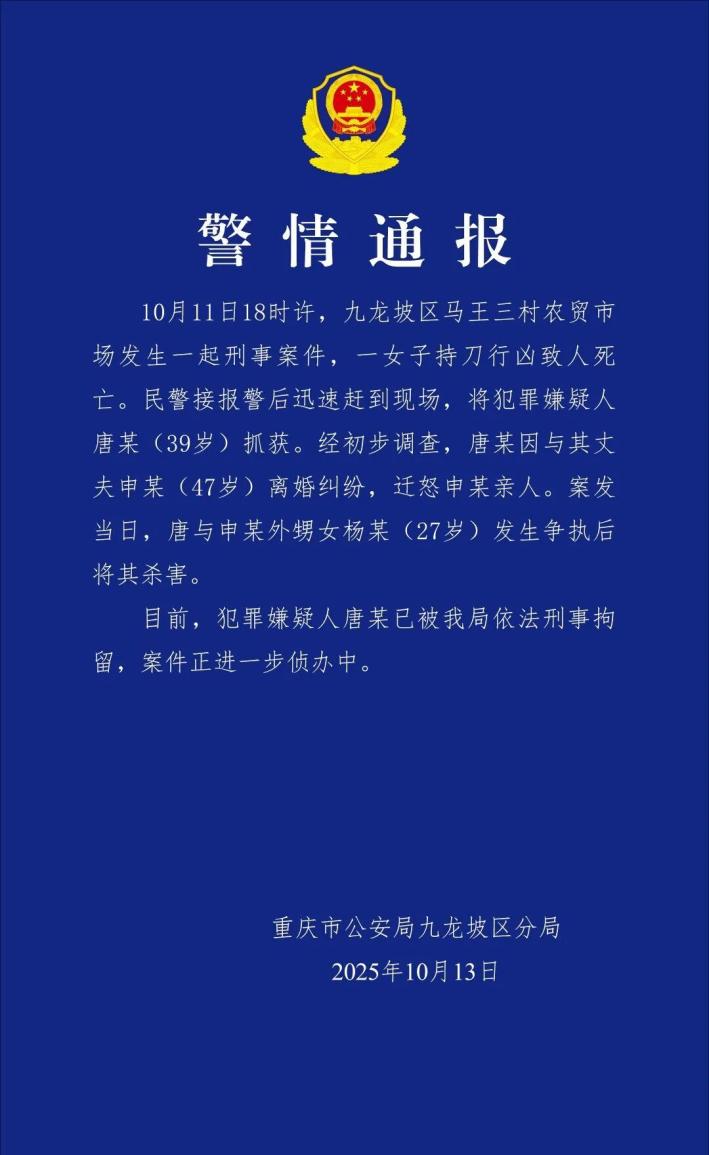 “10月11日18时许,九龙坡区马王三村农贸市场发生一起刑事案件,一女子持刀行凶致人死亡。民警接报警后迅速赶到现场,将犯罪嫌疑人唐某(39岁)抓获。经初步调查,唐某因与其丈夫申某(47岁)离婚纠纷,迁怒申某亲人。案发当日,唐与申某外甥女杨某(27岁)发生争执后将其杀害。