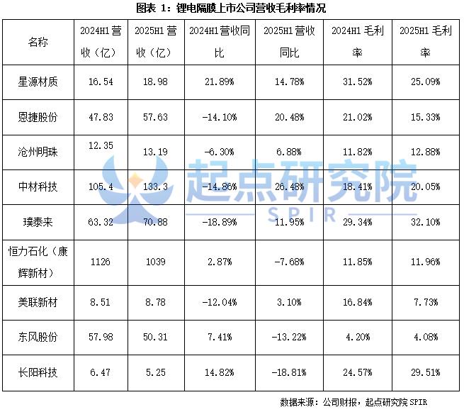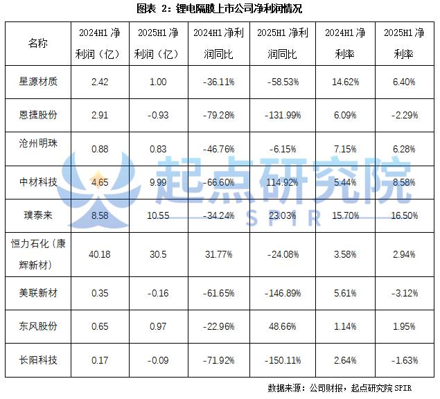 从锂电隔膜上市公司的净利润情况来看2025上半年锂电池隔膜行业受价格持续降低的影响净利润以及净利率普遍下降,仅中材科技,璞泰来,东风股份净利润及净利率同比有所增加。