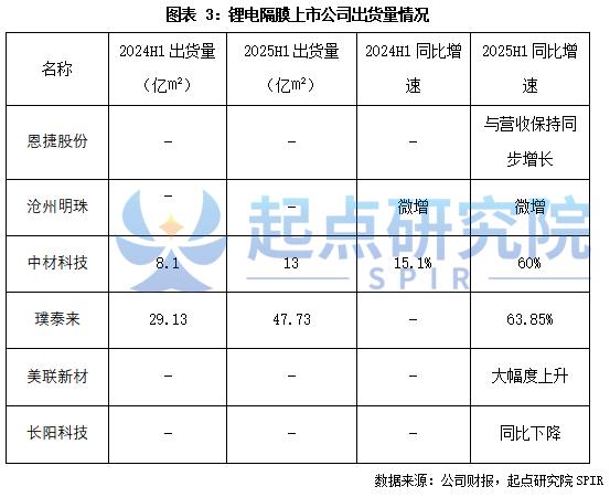 二、锂电隔膜上市公司出货量分析根据2025年半年报已披露的出货量数据来看,2025上半年锂电隔膜出货量同比呈现正增长,其中璞泰来、中材科技披露了具体的出货量数据,璞泰来同比增长63.85%,中材科技同比增长60%,恩捷股份出货量增速与营收保持同步,从恩捷股份锂电池隔离膜产品营业收入同比增长24.83%可以得出其出货量增速约为25%,沧州明珠出货量同比微增,美联新材出货量大幅度上升,长阳科技同比下降,其主要原因为长阳科技在2025上半年收缩了隔膜产品的销售和生产。