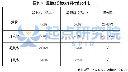 起点研究院SPIR调研数据显示,恩捷股份2025上半年实现营收57.63亿元,同比增长20.48%,净利润为2.07亿元,同比降低131.99%;毛利率和净利率同比均有所下降,其中毛利率同比下降了5.69个百分点,净利率同比下降了8.38个百分点。