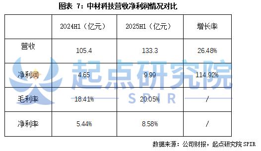 起点研究院SPIR调研数据显示,中材科技2025上半年实现营收133.3亿元,同比增长26.48%,净利润为9.99亿元,同比增长114.92%,毛利率和净利率呈现正增长,毛利率同比升高了1.64个百分点,净利率同比升高了3.14个百分点。