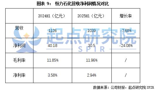 起点研究院SPIR调研数据显示,恒力石化2025上半年实现营收1039亿元,同比下降7.68%,净利润为30.5亿元,同比下降24.08%;毛利率同比微增,上升了0.11个百分点,净利率同比下降了0.64个百分点。