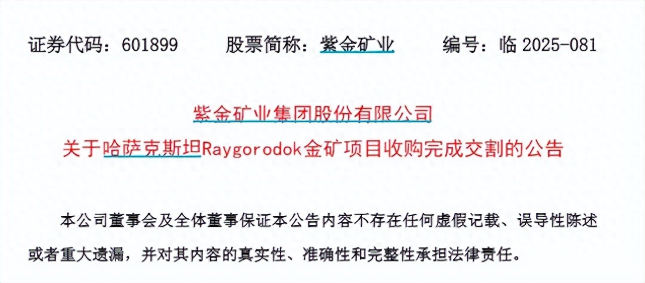 10月12日,紫金矿业发布公告,其控股子公司紫金黄金国际已于10月10日完成哈萨克斯坦Raygorodok金矿(下称“RG金矿”)100%权益交割。此次项目完成交割距紫金黄金国际港股上市仅十日之隔,实现了资本运作与产业发展的紧密衔接,充分彰显该公司在全球化资源配置中的长远战略视野和高效执行力。