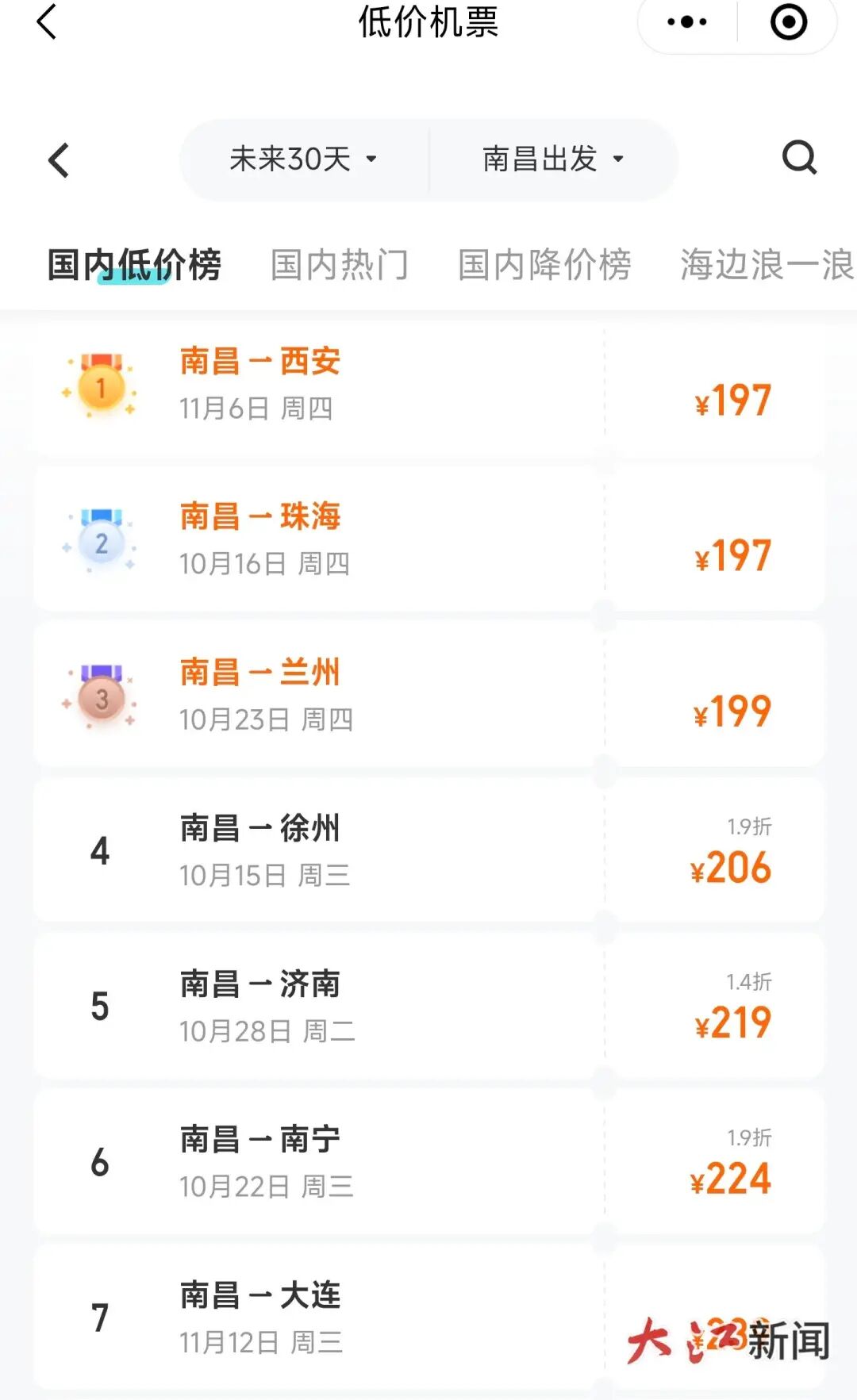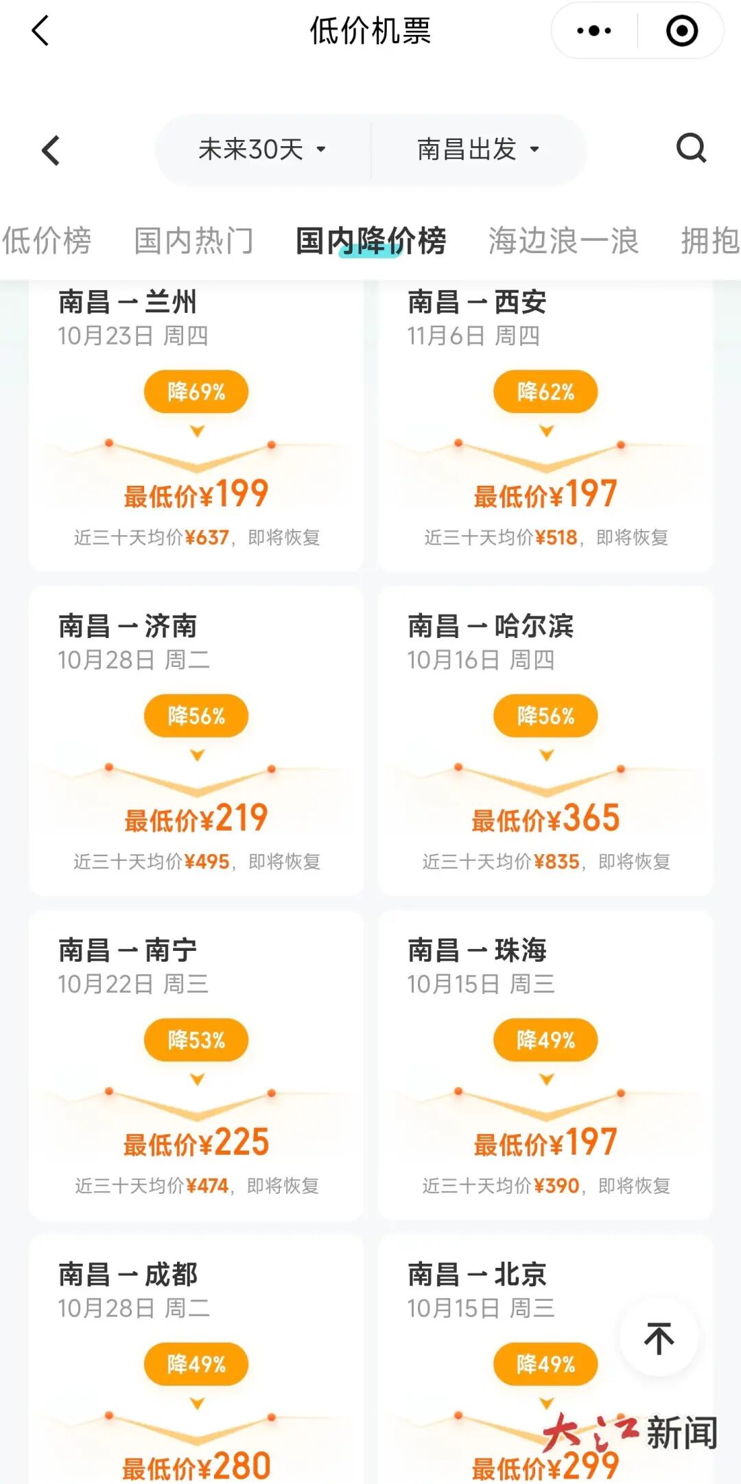 南昌飞往济南、哈尔滨、南宁等热门旅游目的地的机票票价降幅都接近60%以哈尔滨为例10月16日南昌到哈尔滨只要365元