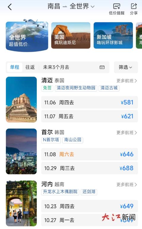 除此之外国庆假期后的出境机票也出现了不同程度的降价去韩国、泰国、越南等地