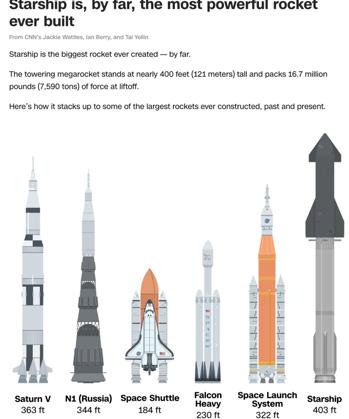△CNN报道,“星舰”高度达到121米,升空时推力达到7590吨,是迄今人类建造的最强大火箭