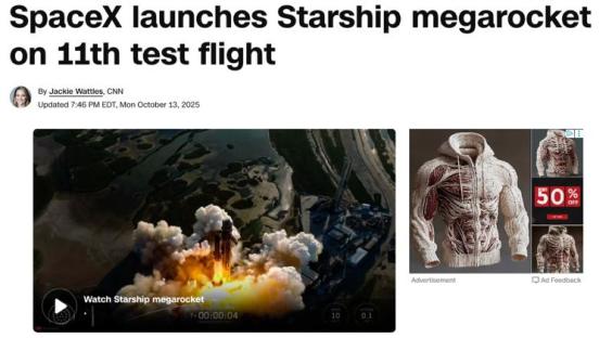 当地时间10月13日晚,在得克萨斯州博卡奇卡发射场,美国太空探索技术公司(SpaceX)新一代重型运载火箭“星舰”成功完成第11次试飞。火箭在起飞后顺利分离,冲出太空又平安回到地球,最后精准落入墨西哥湾海域,实现了让“星舰”“飞回来”的阶段目标——完成从发射到受控落水的完整闭环。