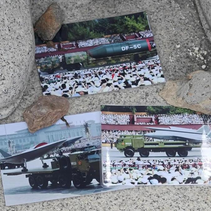 ↑吴石将军雕像前,摆放着三张我国新型武器装备的照片 来源海峡都市报