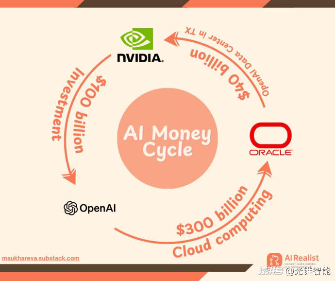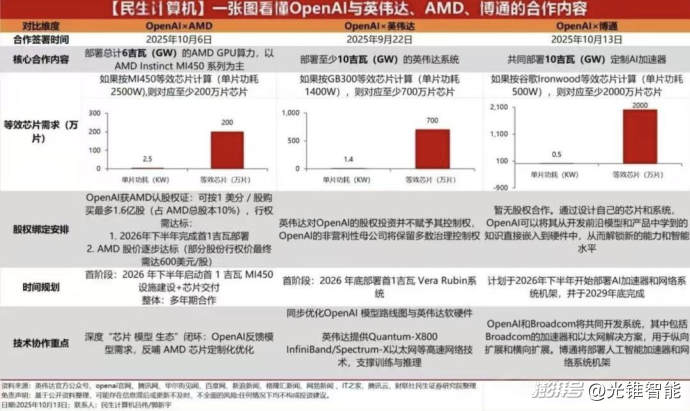 例如OpenAI、英伟达、Oracle之间,OpenAI提供AI、英伟达提供算力基础、Oracle提供数据,三者形成了一个比较完善的生态。参考OpenAI跟英伟达、AMD、博通的合作,那就是英伟达提供成熟GPU、AMD提供补充GPU算力、博通提供定制AI芯片及相关网络设施配套。