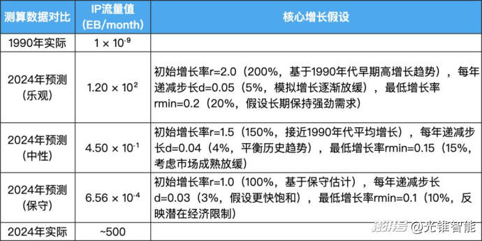 既然AI时代数据传输的基本要素是Token,那我们选择互联网时代的IP流量作为对比参考。假设我们身处互联网时代前夕的1990年,从当时的视角估算现在的互联网IP流量,并于实际进行对比。Grok给出的结论是,2024年实际互联网IP流量是“过去乐观估算”的4倍有余。