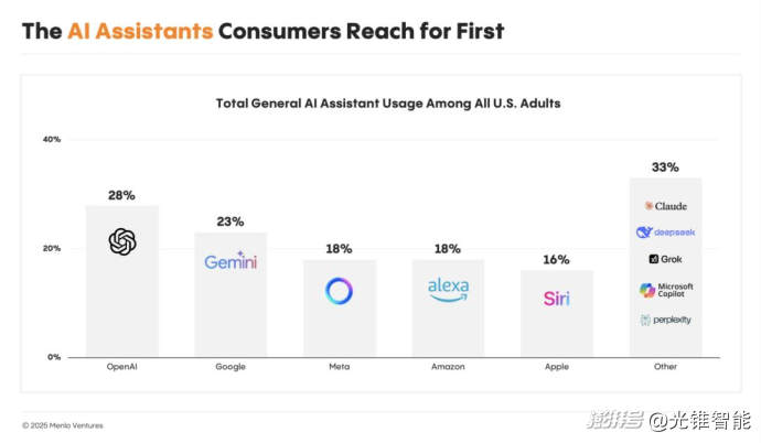 根据调研机构Menlo的数据显示,美国有四分之一的用户会选择ChatGPT作为首要入口。目前整个市场竞争非常激烈,OpenAI虽然处于领先地位,但优势并不算大。关于竞争入口的重要性,Menlo在报告中提到,“消费者几乎总是会首先尝试他们的默认工具。”
