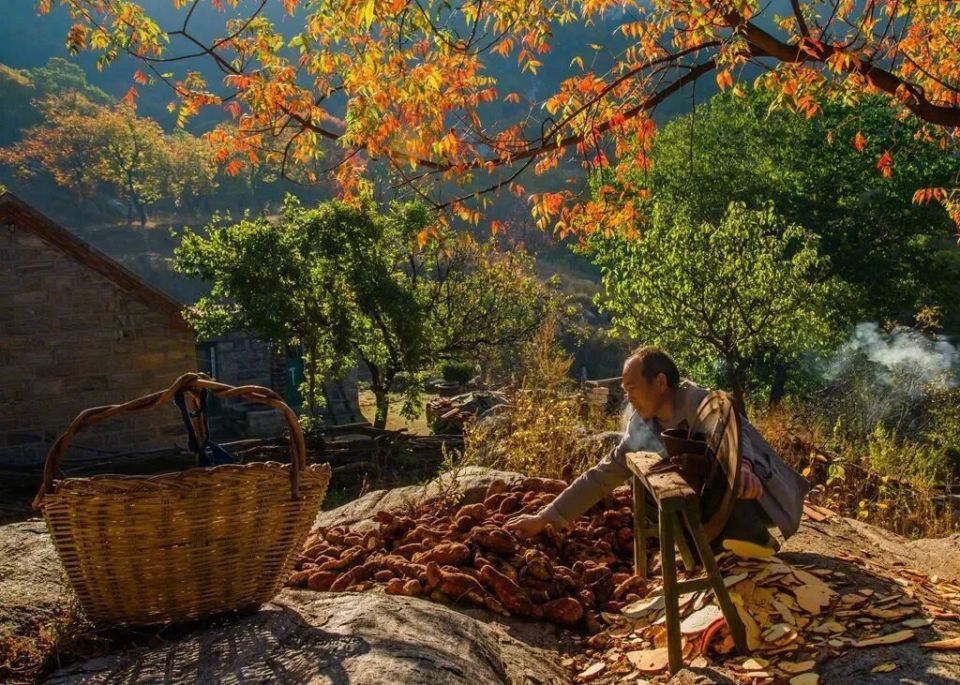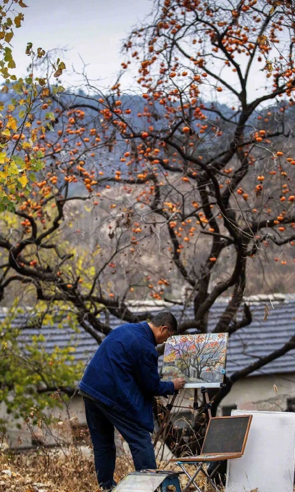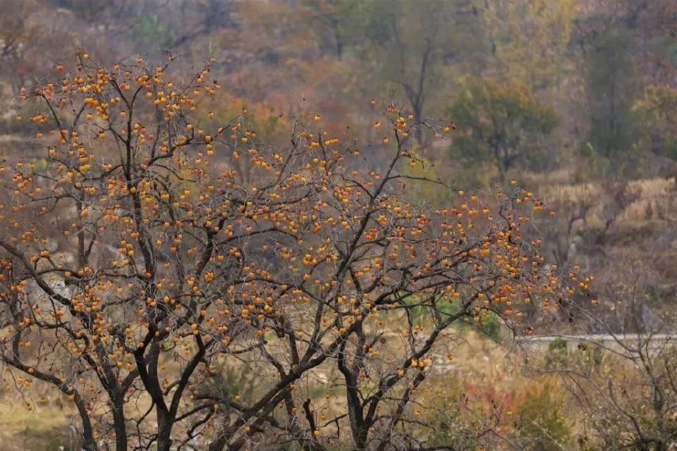 深秋时节,夕阳余晖洒满山谷,层林尽染,乡野间柿子换上红妆,于薄雾中闪烁,将温暖的色彩直抵人心。