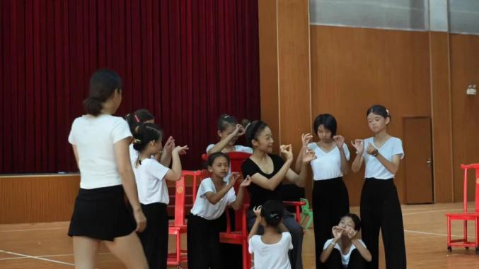 训练时,老师带着孩子们练“绣花”动作尽管如此,戏曲队的组建仍是一波三折——杨梅是舞蹈老师,没学过戏曲;高年级、有舞蹈基础的被其他团队选走,剩下的是没有任何基础、年龄不一的孩子,一切都是从零开始摸索。最终,这支“戏曲队”由8名8至14岁的女学生组成。学校专门请来了株洲市戏剧传承中心与湖南省话剧团的专家,为戏曲队的孩子们量身定制节目剧本,教导基本功。