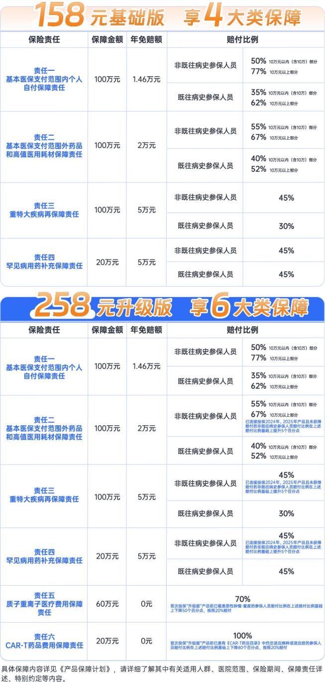 “基础版”保费仍然延续往年的158元/年,解决大病常规治疗花费;258元“升级版”增加质子重离子、CAR-T药品前沿高端疗法,进一步减轻肿瘤患者医疗负担。