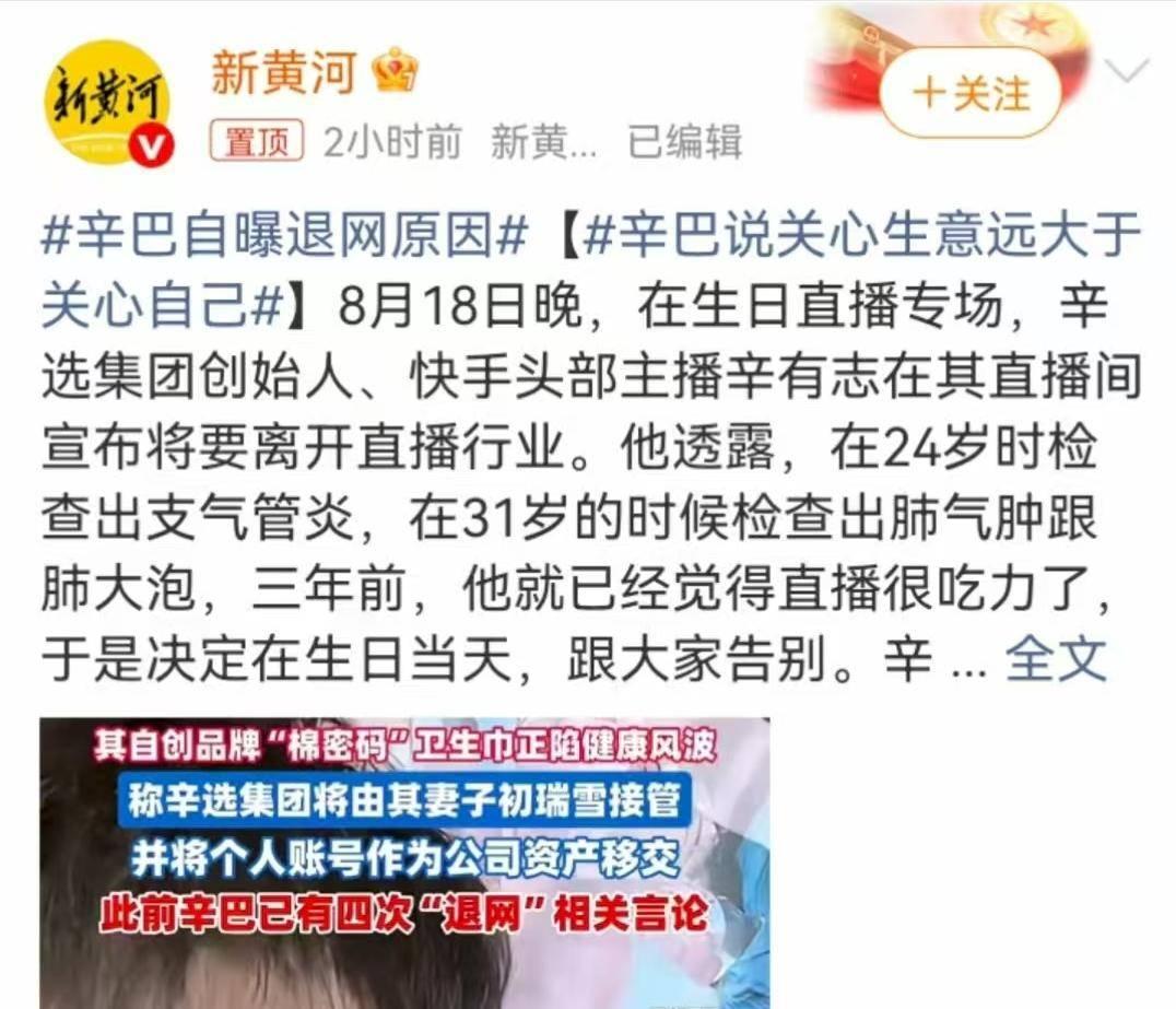 8月,超级主播辛巴第五次“退网”,声称因身体原因“彻底告别直播”,并将账号与公司交由妻子初瑞雪管理。