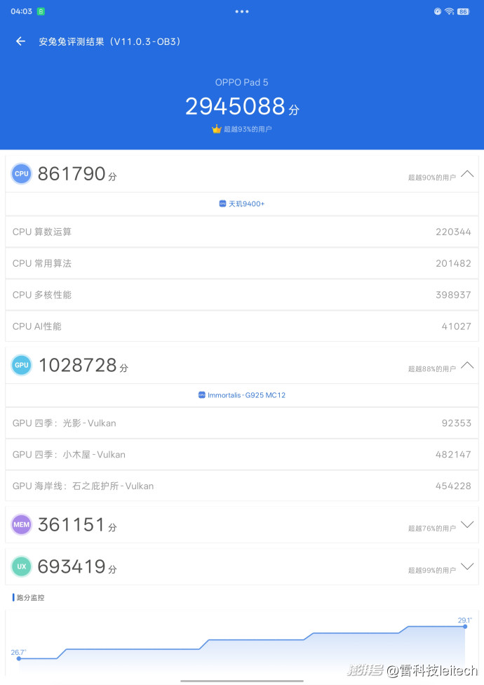 说完「爱优腾」,我们来讲讲 OPPO Pad 5 的性能和一些相对重负载的场景。OPPO Pad 5 采用了天玑 9400+ 旗舰芯片,我们这次拿到的是 16GB+512GB 的版本。其实就性能来说,OPPO Pad 5 的表现完全不需要担心,安兔兔 294 万分的成绩(OPPO Pad 4 Pro 小雷实测分数为 290 万)和原神平均 59.9fps 的表现已经足以证明其硬件实力了。