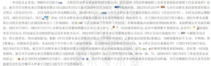 近日,记者从中国裁判文书网获悉,许昌市胖东来百货服饰有限公司(下称“百货服饰公司”)一员工因“未按照规定首先接待顾客”,被公司认定为严重违纪并解除劳动合同。该员工随后提起诉讼,河南省许昌市两级法院审理后均认定公司解除合同合法,驳回了其赔偿请求。