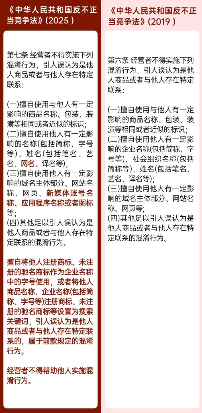 解读:完善关于混淆类不正当竞争行为的规定是新修订的反不正当竞争法的一项主要内容。具体分为四个方面:其一,将擅自使用他人有一定影响的“新媒体账号名称、应用程序名称或者图标”明确为混淆行为。其二,做好与商标法的衔接,明确擅自将他人注册商标、未注册的驰名商标作为企业名称中的字号使用,引人误认为是他人商品或者与他人存在特定联系的,属于混淆行为。其三,规范对搜索关键词的使用,规定将他人商品名称、企业名称(包括简称、字号等)、注册商标、未注册的驰名商标等设置为搜索关键词,引人误认为是他人商品或者与他人存在特定联系的,属于混淆行为。在本次修改之前,关于关键词隐性使用是否构成不正当竞争行为,有两派完全相反的观点,即“肯定说”和“否定说”。本次修法中,将“关键词隐性使用”纳入了新法规制范畴。其四,规定经营者不得帮助他人实施混淆行为。