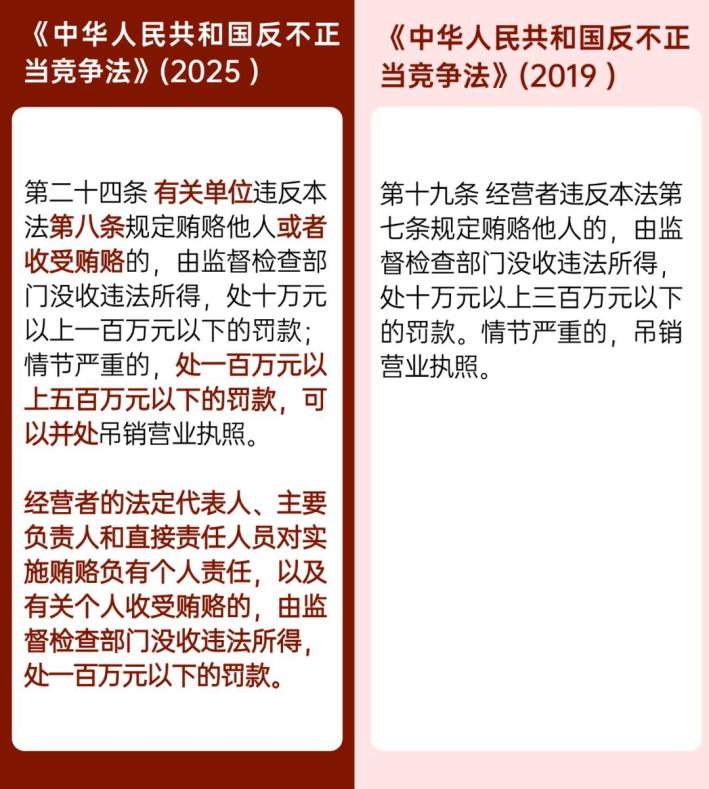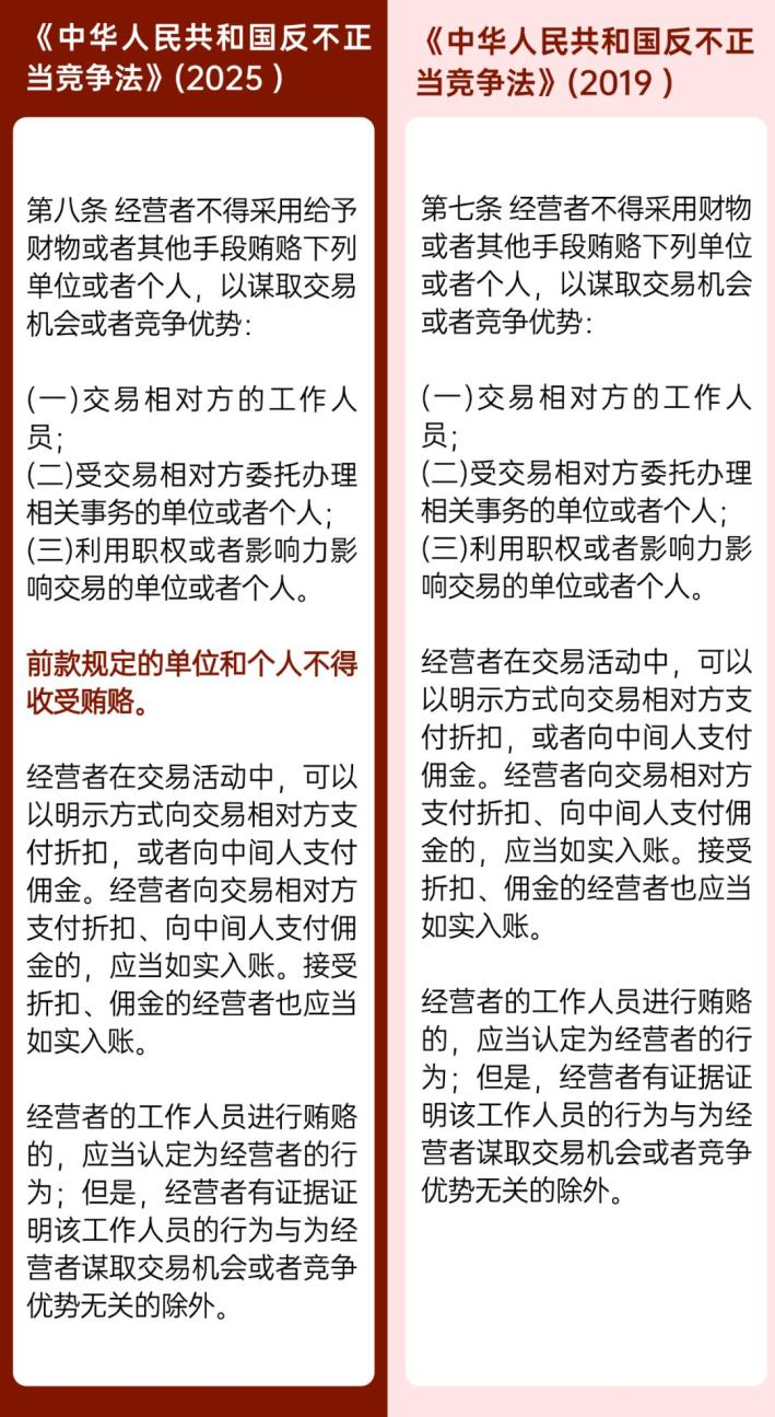 解读:新修订的《反不正当竞争法》第八条增加了有关单位和个人不得收受贿赂的规定,明确对行贿、受贿行为的双向禁止,有利于进一步加大商业贿赂行为的打击力度和威慑力。第二十四条新增了商业贿赂处罚到人的机制,增加经营者的法定代表人、主要负责人和直接责任人员的个人责任。并且,该条将商业贿赂的罚款上限由三百万元上调至五百万元,体现了严厉打击商业贿赂的决心。