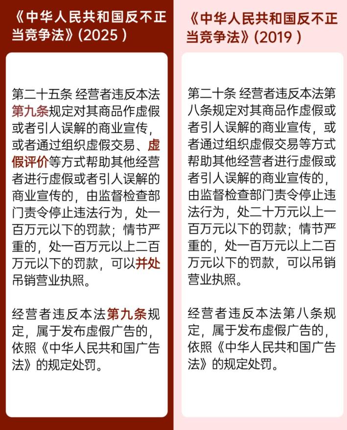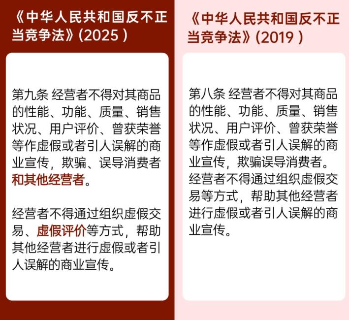 解读:新修订的《反不正当竞争法》第九条将虚假宣传行为误导的对象由消费者扩展为“消费者和其他经营者”,扩大了虚假宣传的规制范围。此次修订后,虚假宣传的危害后果不仅考虑了消费者的合法权益,同时也考虑到了其他经营者的公平交易权和获得信息权等合法权益。该条还新增了“虚假评价”的行为种类,旨在加强对刷单炒信行为的规制,明确不得通过“虚假评价”方式帮助他人实施虚假宣传。同时,第二十五条取消了虚假宣传罚款二十万元的下限,为规制虚假宣传行为提供了更灵活的空间。