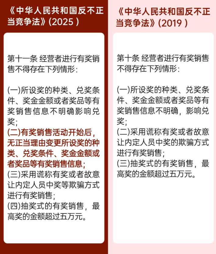 解读:新修订的《反不正当竞争法》第十一条明确了有奖活动开始后,经营者不得随意变更有奖销售信息。其实际吸收了《规范促销行为暂行规定》中第十三条的“禁止变更”规则,“经营者在有奖销售前,应当明确公布奖项种类、参与条件、参与方式、开奖时间、开奖方式、奖金金额或者奖品价格、奖品品名、奖品种类、奖品数量或者中奖概率、兑奖时间、兑奖条件、兑奖方式、奖品交付方式、弃奖条件、主办方及其联系方式等信息,不得变更,不得附加条件,不得影响兑奖,但有利于消费者的除外”。该条在新增的第二项中以“正当理由”向变更有奖销售信息的经营者提出要求,与《规范促销行为暂行规定》第十三条相比较为宽松灵活。