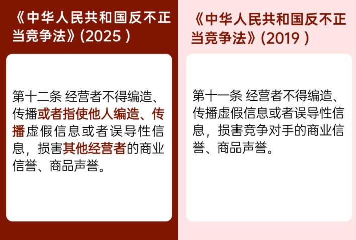 解读:新修订的《反不正当竞争法》第十二条明确了经营者不得“指使他人”进行商业诋毁,并将商业诋毁的对象由“竞争对手”扩展为“其他经营者”。实践中,“指使他人”比较多见的场景包括: ① 雇佣水军、口碑机构灌水的行为。 ② 推广机构反向刷单和恶意评价的行为。③ 营销机构/MCN机构/网络红人反向种草和其他比较广告行为。