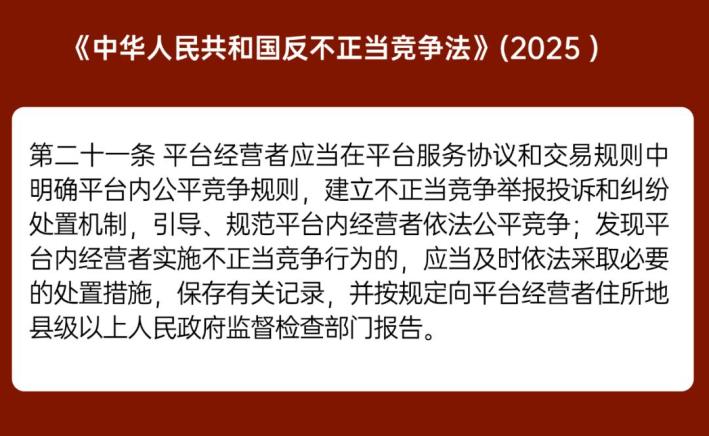 解读:新修订的《反不正当竞争法》新增第二十一条,要求平台经营者建立不正当竞争的投诉和处置机制,并规定了平台处置不正当竞争、记录、报告的义务。该条的出台标志着我国竞争治理的重心正在下沉,不再仅仅满足于事后惩戒具体的违法者,而是着眼于事前预防,全面压实平台责任,将维护公平竞争的责任部分地“前置”于平台。