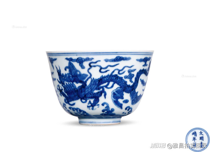 紧随其后的是来自郭炳湘先生旧藏的明嘉靖 青花翼龙纹仰钟式碗以178.25万元成交。此碗敞口,深腹,圈足。外壁以青花绘海水祥云翼龙纹,双翼龙以壬字形云纹区隔,躯干强劲有力,身侧生出双翼,拍翅升腾于云海间,似在兴云布雨。碗心饰一升翼龙纹,周身祥云环绕。底款落青花双圈“大明嘉靖年制”六字双行楷书款。