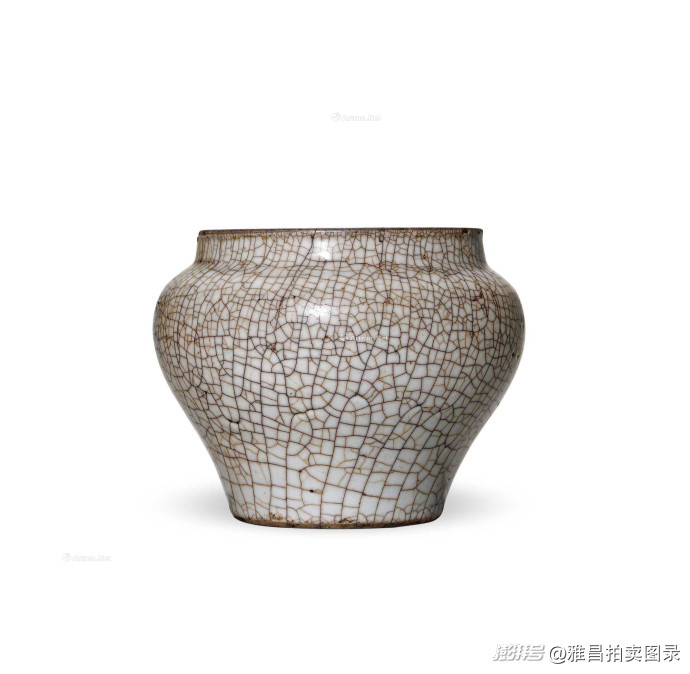哥窑为宋代五大名窑之一,哥釉瓷器不尚纹饰、利落雅致,釉质纯粹而莹润,气韵古朴,以 “金丝铁线”“紫口铁足” 为标志性特征,历朝历代多有仿制,成为士大夫阶层的精神寄托和审美品位之象征。目前所知传世哥釉瓷器多属盘、碗、洗、炉类,瓶、罐较少见,本品造型敦厚,小器大样,殊为难得,十分珍贵。