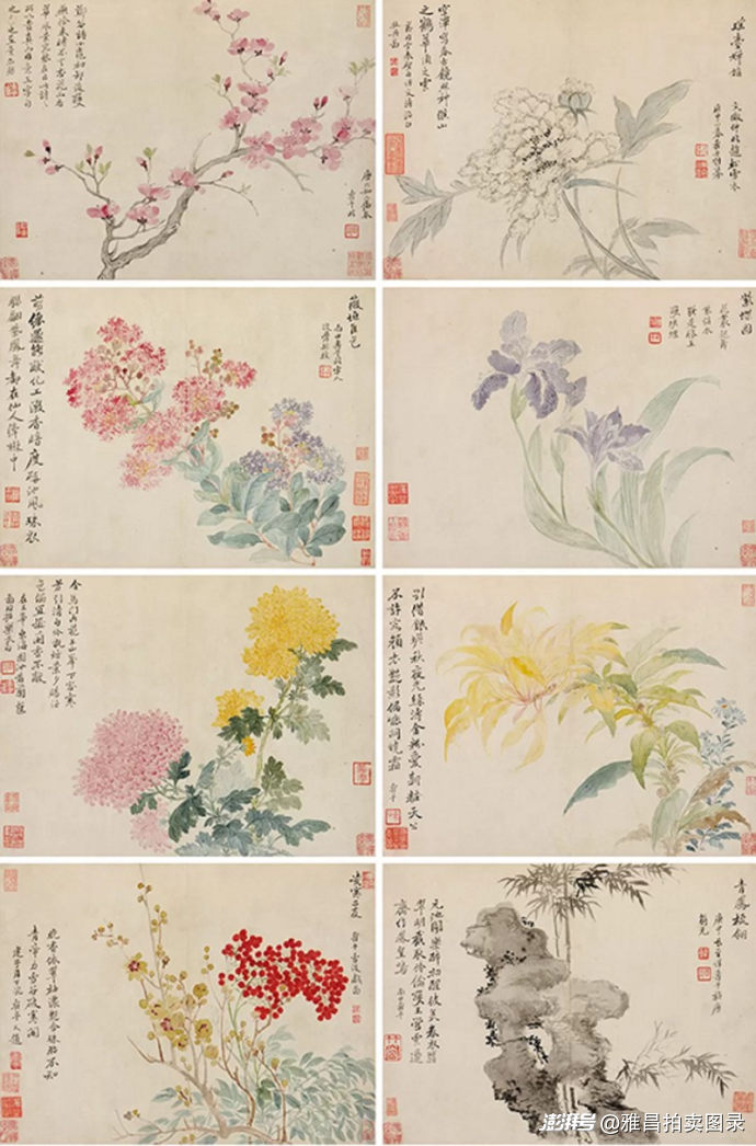 恽寿平的花卉画对后世影响很大,任伯年、吴昌硕、张大千、吴湖帆、庞莱臣、刘海粟、张大壮、陆抑非、沈子丞等名家都临摹过他的作品。近现代的庞莱臣、吴湖帆、张葱玉等一批收藏大家都争先恐后地珍藏恽寿平的力作。上世纪八十年苏富比、佳士得开拍中国书画后,恽寿平的作品就成为拍卖场上的固定拍品。1987年,纽约市场推出了《花卉鸣禽图》,尺幅仅4平尺,上拍后受到热烈追捧,最后以6.6万美元成交,这个价格在当时并不低。之后,他的作品在纽约市场亮相较多,且成交率较高,价格基本维持在1—3万美元之间。90年代初国内兴起艺术拍卖后,恽寿平的书画作品亮相较多,但整个九十年代他的作品并不抢手,价格一般,特别是与“清四王”相比,有较大差距。步入21世纪后,随着中国书画价格大幅上扬,恽寿平作品价格出现了较大幅度上扬,2004年恽寿平《花卉十二开册》在中贸圣佳以660万元成交;同年,中国嘉德隆重推出恽寿平精心之作《花卉八开册》,这本册页原为大收藏家庞莱臣收藏,后转给了大藏家王南屏,上拍后以683万元成交,15年后,也就是2019年北京保利再推此作,尽管当年宏观经济形势不甚理想,但该册仍受到众多藏家的追捧,不少藏家你争我夺,互不相让,最后以高达7475万元成交,不仅创下恽寿平花鸟画的最高价,而且15年价格翻了10倍多,原藏家获利极其丰厚。