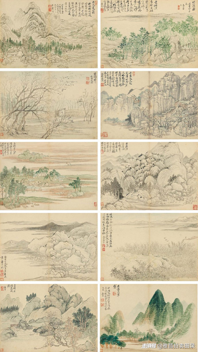 他的山水也有可观的市场行情。《载鹤图》手卷也是庞莱臣旧藏,2006年在中贸圣佳获价1111万元;2008年中国嘉德再推此作,仍很受追捧,以高达3696万元成交,2年时间价格翻了2倍多。尤值得一提的是:恽寿平《仿古山水十开册》曾21次被出版,2007年中国嘉德上拍时,只以123.2万元成交;2016年北京保利再推时以高达8165万元成交,9年价格上涨了8千万元,轰动拍场。