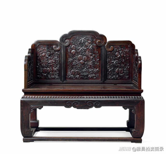 此专场的领衔拍品为清乾隆 紫檀瑞果纹有束腰带托泥马蹄足宝座,在拍卖现场以1000万港元落槌,加佣金1185万港元成交。宝座系皇权之象征,为皇室成员御用之物,其制作在尺寸、装饰与用材等方面均有严格规制。此件紫檀宝座,用料奢华,造型端庄,雕刻精美,是典型的清代宫廷御用家具。宝座主要有三屏式和五屏式两种基本形制,区别在于构成座围的镶板数量。本例即为五屏式宝座。靠背三屏,攒框装板,铲地浮雕瑞果纹饰之「瓜瓞绵绵」纹,其上果实、叶片、花卉造型饱满丰盈,藤蔓卷曲生动,雕琢细腻传神。瓜藤之上结出累累硕果,枝叶蔓延,花卉间次绽开,图案充满连续性和律动感,展现「绵绵不绝」的生机与活力。以果实之多籽,表达了对血脉永续、江山代代相传的祈望,是中式传统寓意美学与西洋巴洛克装饰手法的完美融合。
