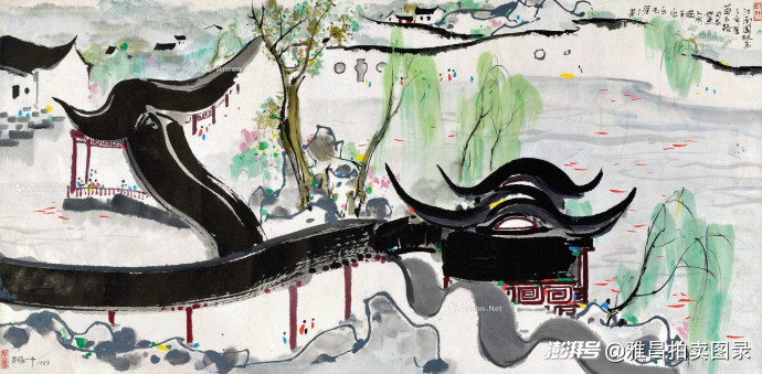吴冠中《江南园林鱼之乐》494.5万元成交:此幅作品为其抽象水墨成熟期的经典之作,采用大尺幅全景式构图,将江南园林的美学精髓巧妙融入画中,细节刻画精致入微。