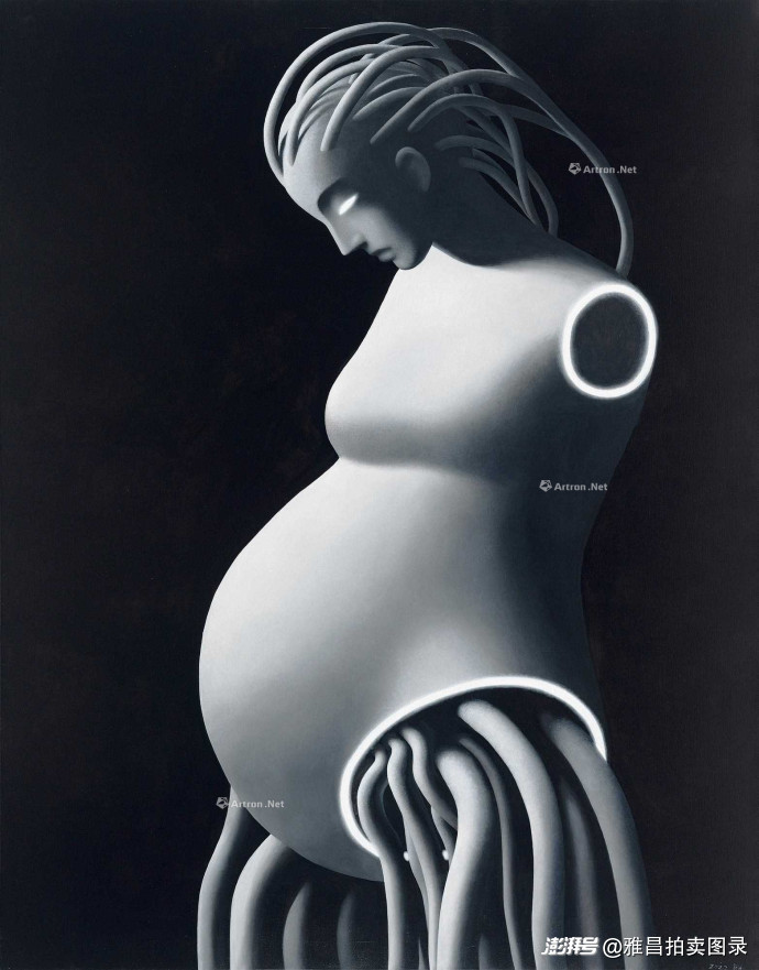 谭永勍《智能之母》80.5万元创个人拍卖纪录:以科幻寓言的方式探讨后人类主题,塑造了一个介于生物与机器之间的"母亲"形象,展现了年轻艺术家的创新思维。