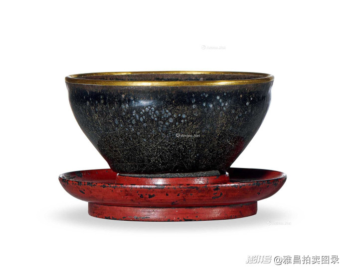 明建窑油滴深斗盏172.5万元成交:油滴分布如烟花下坠,釉色呈浓重黑灰色,随光线角度变化可产生金色、银色或蓝色光晕,存世少见。