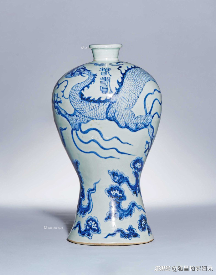 明洪武青花"春寿"款梅瓶1035万元成交:瓶外壁以青花通景式绘饰云龙纹,肩部篆书"春寿"二字,诠释了帝王对"长春与寿宁"的愿景,是本场领衔拍品。