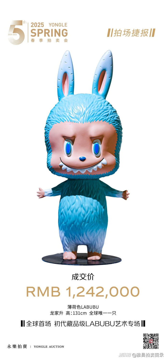 6月10日下午,全球首场初代藏品级LABUBU艺术专场以100%成交率圆满落槌,总成交额372.54万元,斩获"白手套"殊荣。一件高131厘米的薄荷色LABUBU以124.2万元成交,刷新LABUBU系列全球拍卖纪录。永樂拍卖现当代艺术部表示,未来将持续深耕潮流艺术领域,每月定期举办LABUBU及潮流艺术直播拍卖专场,6月22日将在"永乐Bill有画说"进行首场初代LABUBU艺术直播专场。