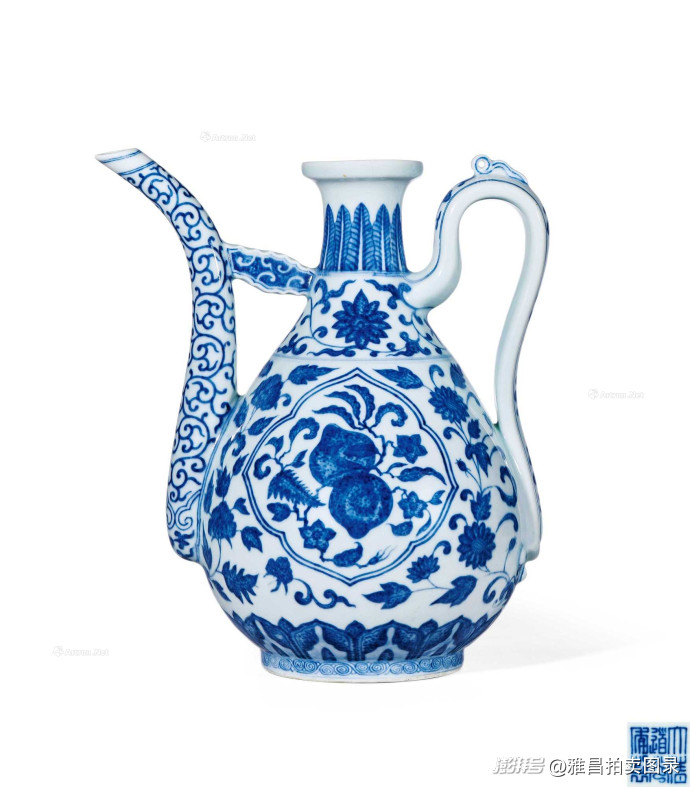 清道光 青花缠枝开光枇杷寿桃纹执壶