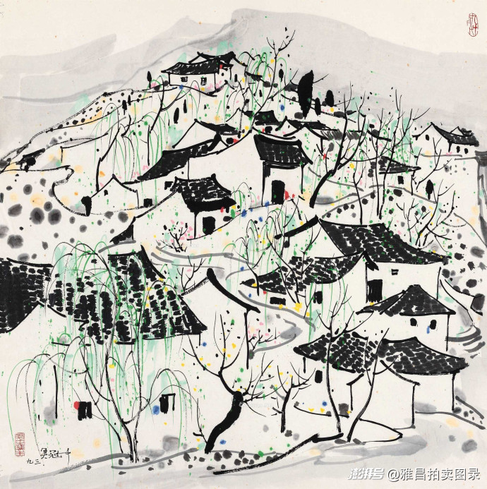 吴冠中1993年的写生作品《山村》以575万元成交。白墙黑瓦的江南民居是吴冠中对于故乡的深情记忆,也是他这一时期的作品中最常见的符号。