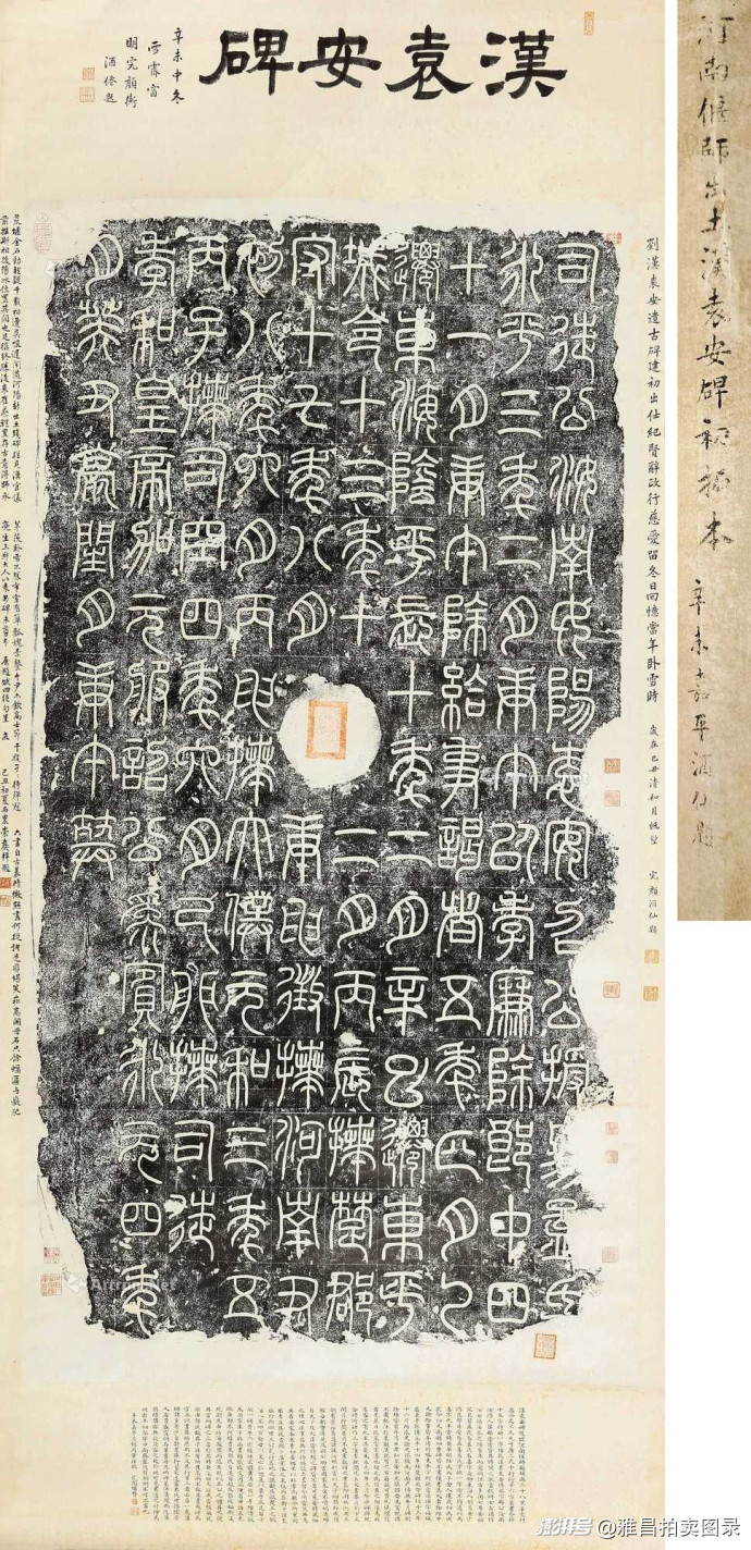 《汉·司徒袁安碑》拓本109.25万元成交:郭玉堂、完颜衡永旧藏,完颜衡永、崇彝、完颜继贤题跋,完整展现东汉篆书神韵,是金石学研究的重要资料。