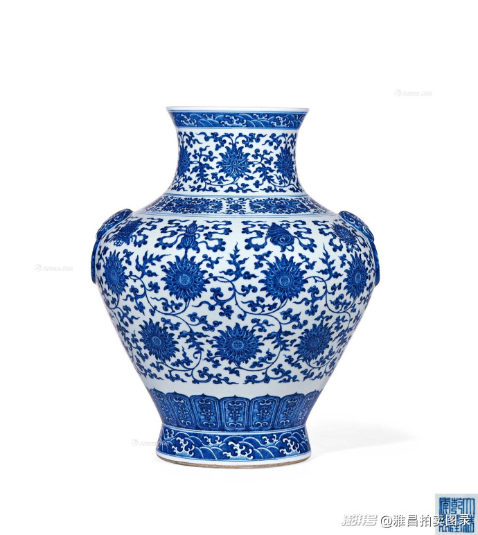 清乾隆青花缠枝蕃莲托"八吉祥"纹铺首尊764.75万元成交:造型取意汉壶,纹样层次丰富,规制严谨,体现了乾隆时期瓷器工艺的高超水平。