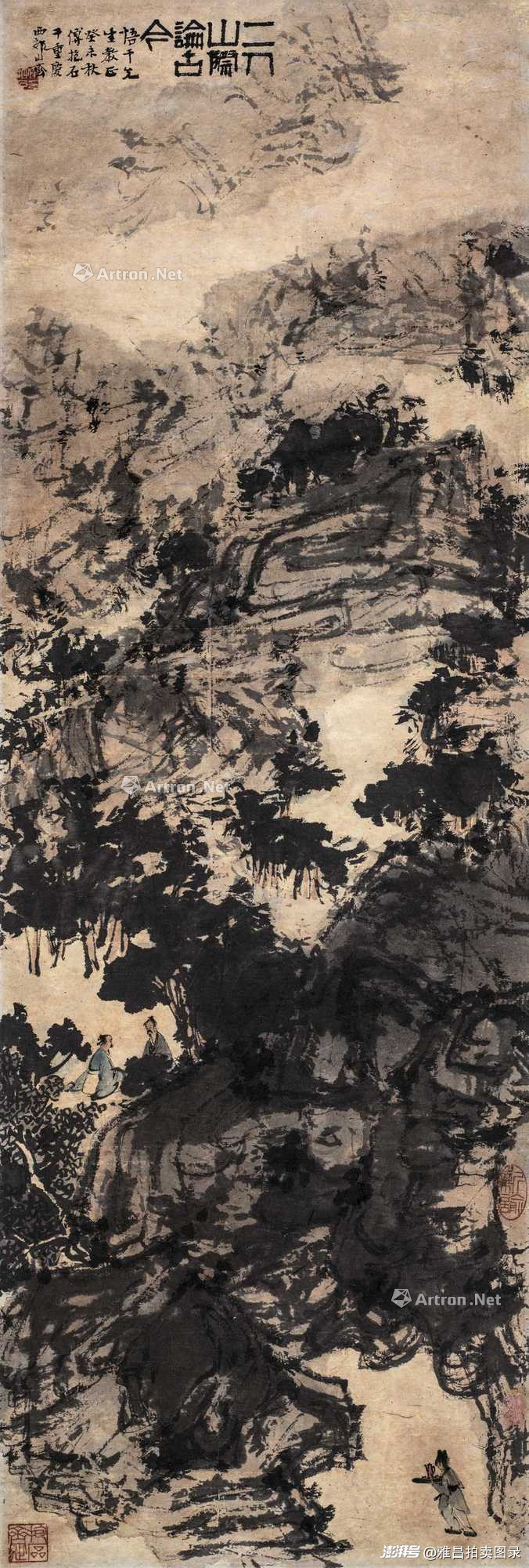 傅抱石《二人山际论古今》598万元成交:创作于1943年,正是傅抱石在重庆潜心创作的时期,画面意境深邃,章法新颖,表现出巴蜀山水之苍茫厚重的特质。