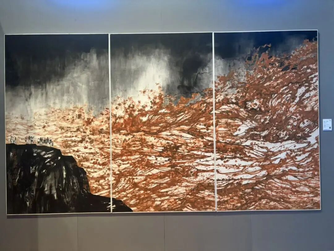 其中,长达54.64米的巨幅水墨长卷《大河奔腾》成为全场焦点。作品以精湛水墨笔法凝练黄河九曲奔涌的磅礴气势,既生动呈现了母亲河的雄浑壮阔之象,更深刻隐喻了中华民族生生不息、奋勇向前的精神图腾。