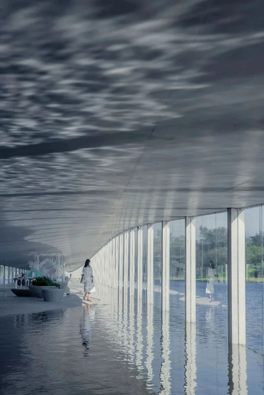 园区中极负盛名的,是由日本建筑大师石上纯也设计的在水美术馆。建筑全长近1000米,横跨湖面,低伏轻柔,与地景融为一体,展馆两侧全为通透玻璃,视线所及,全是粼粼波光。